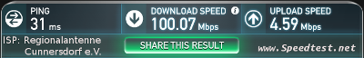 Ein heutiger Test an einem ganz normalen Kabelmodem, wie Sie es auch benutzen, hat ergeben, dass unsere Technik für Einhundert Megabit und mehr gerüstet ist.