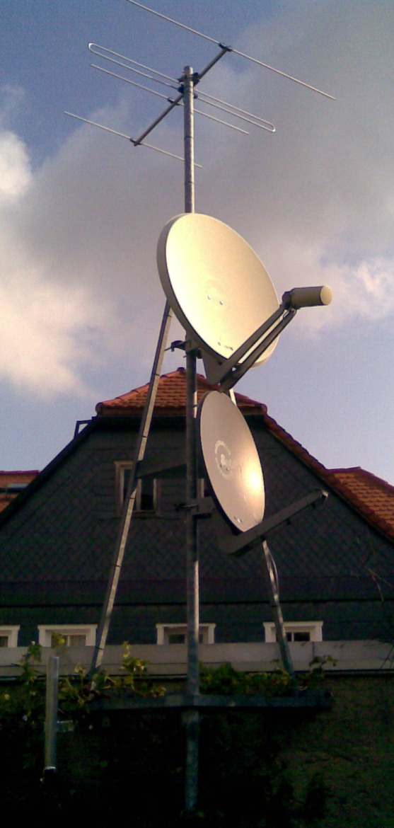 Antennenmast mit UKW (Löbau) Antenne und 2 Satellitenantennen.